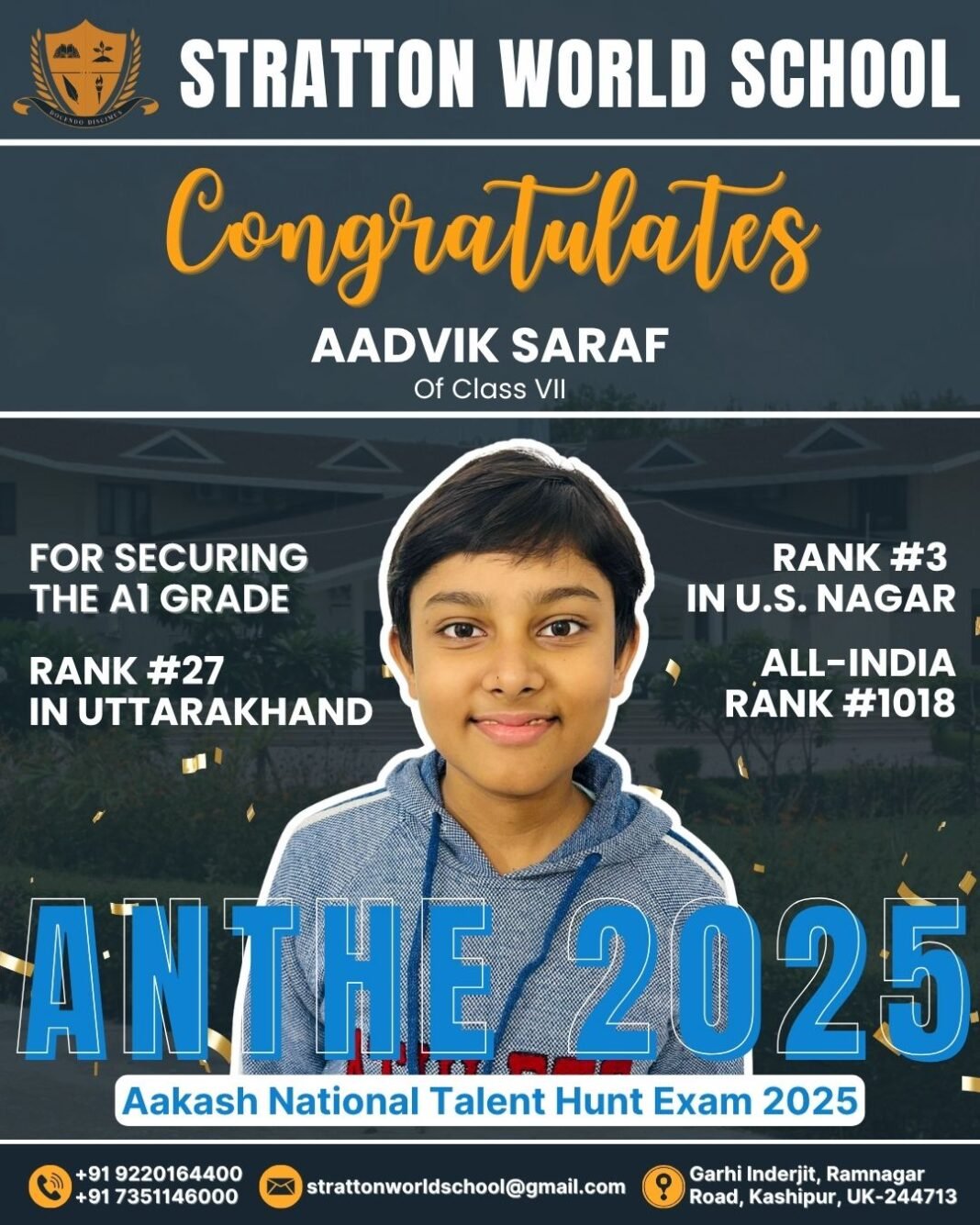 काशीपुर। रामनगर रोड स्थित स्ट्रैटन वर्ल्ड स्कूल के कक्षा सातवींके छात्र आद्विक सर्राफ ने एंथे-2025 (आकाश नेशनल टेलेंट हंट) में पूरे ऊधमसिंह नगर में तृतीय तथा उत्तराखंड में 27वाँ स्थान प्राप्त किया है गौरतलब है कि यह परीक्षा पूरे भारतवर्ष में होती है जिसमें न केवल भारतीय अपितु अन्स देशों के विद्यार्थी भी परीक्षा देतें हैं। इस परीक्षा में आद्विक ने सम्पूर्ण भारतवर्ष में 1018वाँ स्थान प्राप्त कर अपने परिवार तथा विद्यालय का नाम रौशन किया है। आद्विक की इस उपलब्द्धि पर विद्यालय की प्रबंधिका हरप्रीत कौर तथा को-प्रबंधिका शिरीन सैनी ने हर्ष व्यक्त करते हुए उनके उज्जवल भविष्य की मंगल कामना की। इस अवसर पर समस्त विद्यालय परिवार उपस्थित रहा।