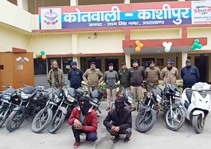 काशीपुर। काशीपुर पुलिस ने दड़ियाल रोड पर मारिया स्कूल के पास चेकिंग के दौरान दो शातिर वाहन चोरों को गिरफ्तार कर उनके कब्जे से 9 मोटर साईकिल व एक स्कूटी बरामद की है। पुलिस के अनुसार पकडे गए अभियुक्त थाना आईं टी आईं क्षेत्रांगत ग्राम वीरपुर कटैया के रहने वाले हैं। इस मामले में क्षेत्राधिकारी काशीपुर अनुषा बडोला के निर्देशन व प्रभारी निरीक्षक काशीपुर मनोज रतूड़ी के नेतृत्व में गठित पुलिस टीम के एस आईं मनोज जोशी , एस आईं सुनील सुतेड़ी, एस आईं कंचन पड़लिया के द्वारा गहन पतारसी सुरागरसी की गयी। वहीं चोरी के खुलासे को लेकर कोतवाली में सी ओ काशीपुर अनुषा बडोला ने प्रेस वार्ता की।