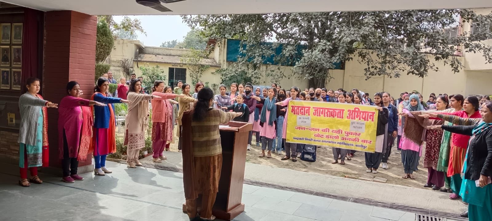 काशीपुर।चन्द्रावती तिवारी कन्या स्नातकोत्तर महाविद्यालय, काशीपुर में मतदाता जागरूकता कार्यक्रम SVEEP के अन्तर्गत मुख्य निर्वाचन अधिकारी, उत्तराखण्ड के दिशानिर्देशानुसार प्रस्तावित “चुनाव का पर्व, देश का पर्व” थीम के अन्तर्गत युवा मतदाता महोत्सव का आयोजन किया गया। जिसमें महाविद्यालय प्राचार्या डॉ0 कीर्ति पन्त द्वारा महाविद्यालय के समस्त स्टाफ को मतदान की उपायोगिता एवं अपने मताधिकार का उचित प्रयोग करने की जानकारी दी, तथा कैम्पस एम्बेडसर डॉ0 रंजना ने युवा मतदाताओं एवं महाविद्यालय की समस्त छात्राओं, प्राघ्यापकों एवं शिक्षणेत्तर कर्मियों को मतदान की शपथ दिलायी। इस अवसर पर एसो0 प्रोफेसर डॉ0 दीपिका गुड़िया आत्रेय, डॉ0 वन्दना सिंह, डॉ0 रमा अरोरा, असि0 प्रोफेसर डॉ0 दीपा चनियाल, डॉ0 अंजलि गोस्वामी, डॉ0 गीता मेहरा, डॉ0 ज्योति गोयल, श्रीमती शीतल अरोरा, डॉ0 ज्योति रावत, डॉ0 पुष्पा धामा, डॉ0 मीनाक्षी पन्त, डॉ0 मंगला, श्रीमती कृति टण्डन, कु0 किरन एवं समस्त शिक्षणेत्तर स्टाफ उपस्थित रहा।